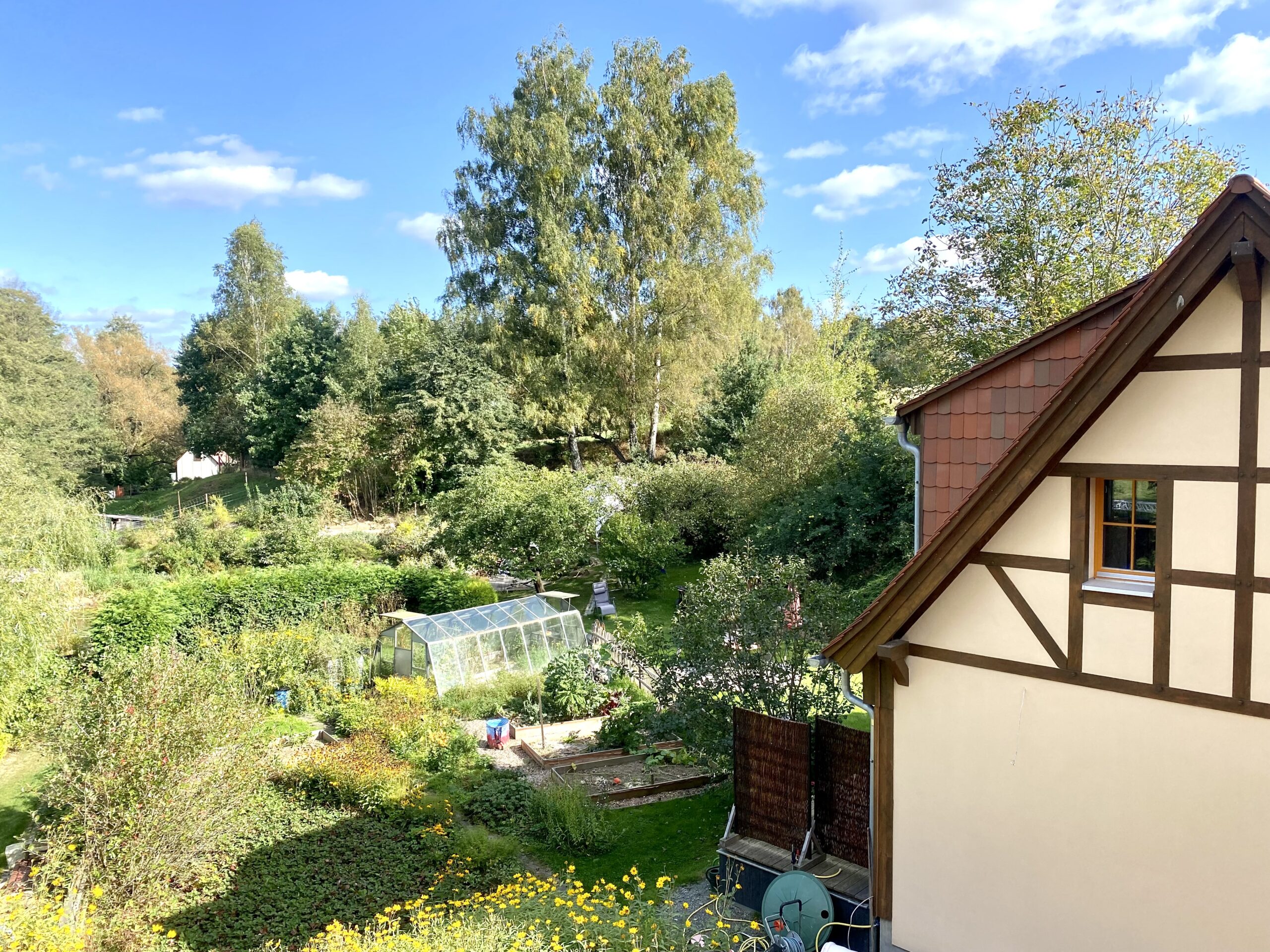 Inmitten eines Obst-, Kräuter- und Gemüsegartens befindet sich der kleine Weiler bestehend aus drei Gebäuden. Ein Naturteich und Sauna dürfen natürlich nicht fehlen.